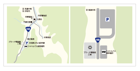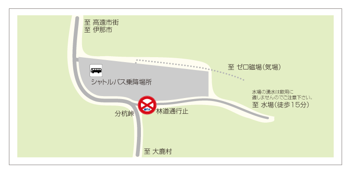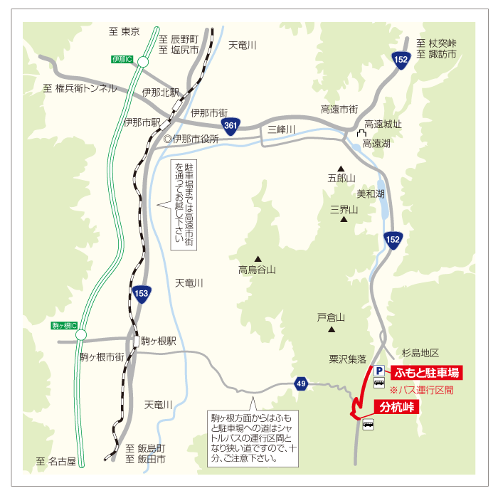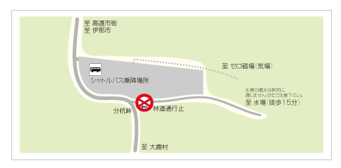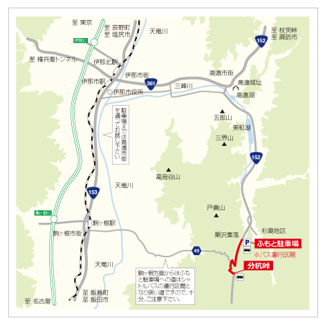 - 分杭峠ふもと駐車場まではお近くの駅から公共の交通機関は運行しておりません。公共の交通機関を利用した場合は最寄りのバス停から徒歩(約2km)又はタクシーをご利用下さい。